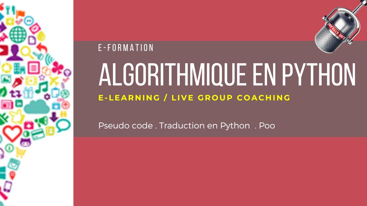 Algorithmique en PythonDans cette e-formation, vous allez apprendre à écrire des algorithmes en pseudo code et à les traduire en code Python : structures de base, choix et boucles, tableaux, fonctions et procédures, algorithmique orienté objet. Vous aurez aussi une première approche de la programmation en langage Python. Pré-requis : aucun..