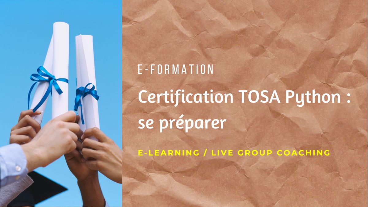 Certification Python TOSAL'objectif de cette formation est de se préparer à passer une certification TOSA en Python3: détails du référenciel, conseils pratiques pour le jour J, rappels de Python, exercices travaux pratiques et Quiz Python. Pré-requis : connaissance de Python.