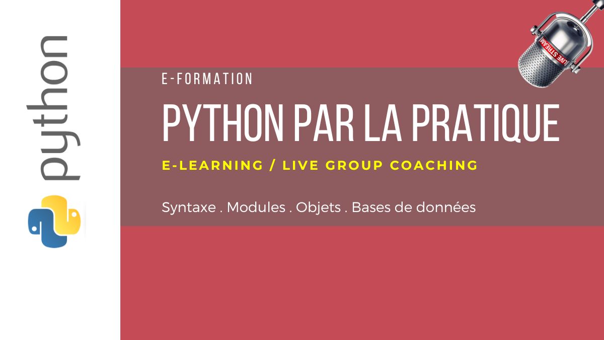 Python par la pratiqueVous allez apprendre à programmer en langage Python : syntaxe, fonctions, chaînes, fichiers et modules, programmation orientée objet, interagir avec une base de données SQL. Avec ces compétences, vous pourrez ensuite faire Python pour : le web, la Datascience ou le Big data. Pré-requis : savoir utiliser un ordinateur, rudiments de programmation (un plus).